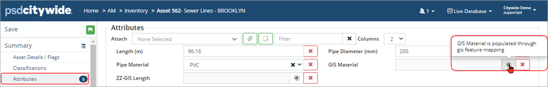 The above screenshot shows that Asset #562 has five attributes: Length (m), Pipe Diameter (mm), Pipe Material, GIS Material, and ZZ-GIS Length.  The latter two are actionable GIS attributes and cannot be edited at the asset level.