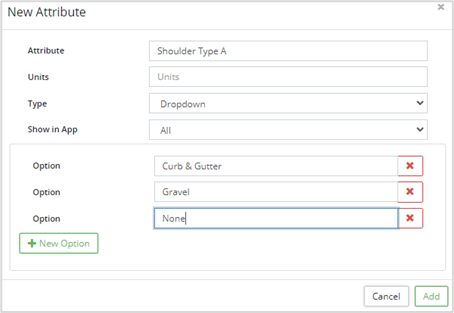 1. If creating a Dropdown type attribute, click  +New Option  and enter a value in the Option field. Repeat this process until all dropdown options have been added.
