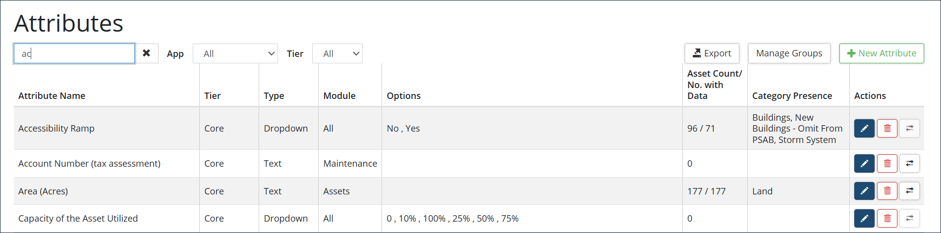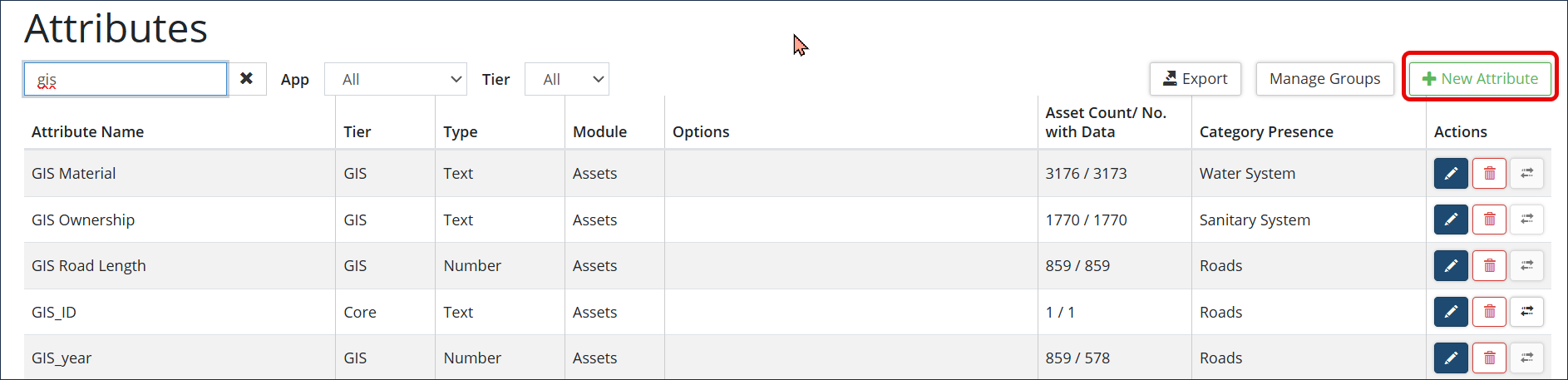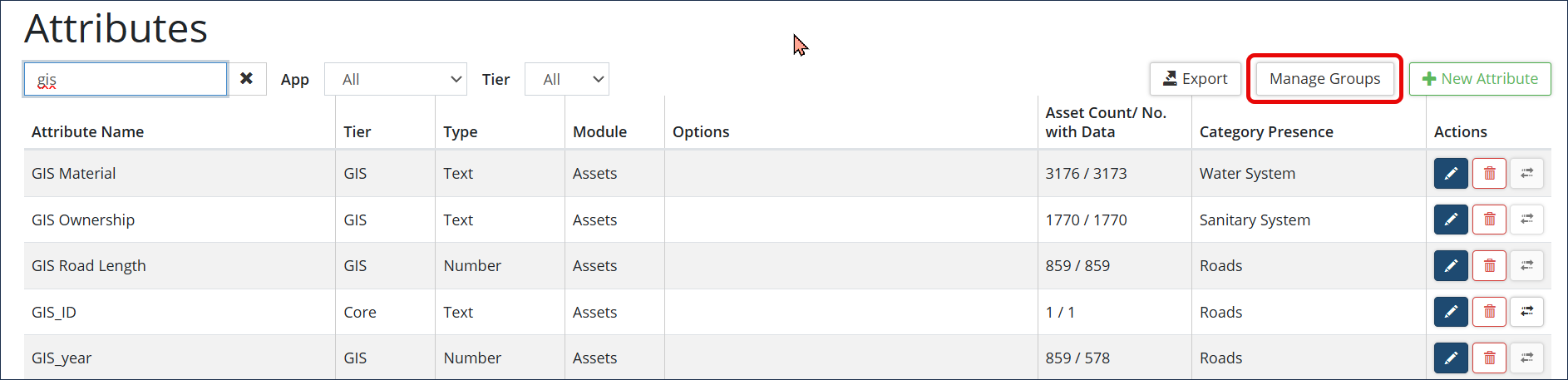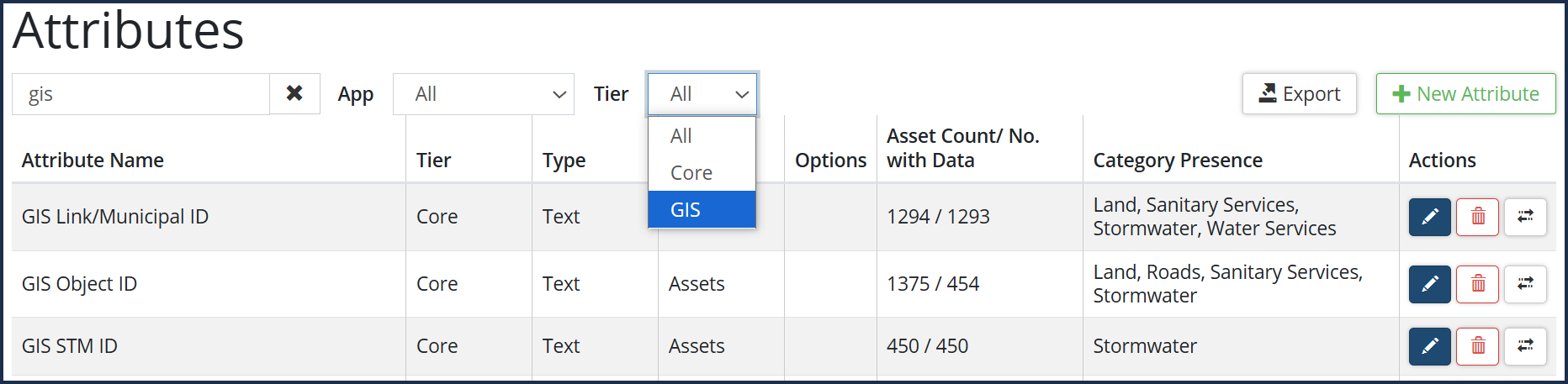 Tier Only visible on databases with Actionable GIS Attributes configured. Actionable GIS attributes link asset attributes to GIS attributes so that the values within these attributes populate nightly from the GIS dataset.