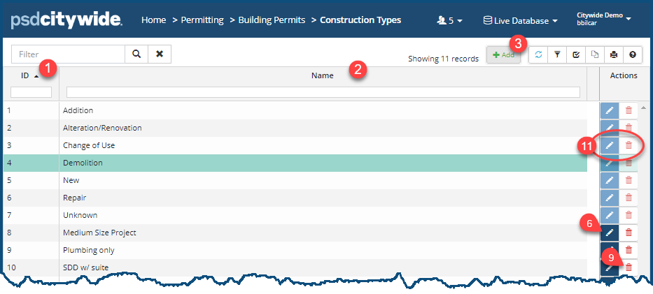 The Construction Types screen is very simple. Each construction type involves two fields: the construction type ID ❶ (which is automatically assigned by the system) and the (user-provided) Name ❷ of the construction type.