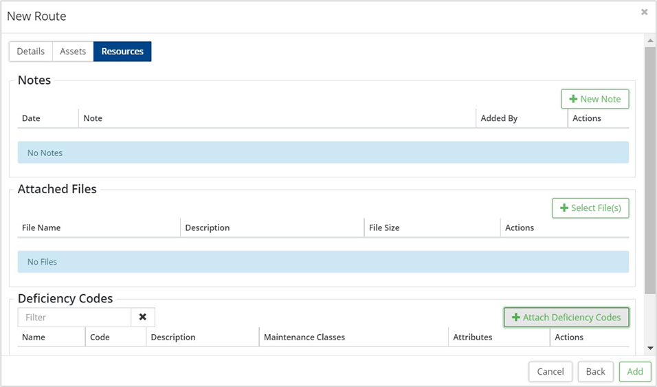 - In the Resources section, add notes, attach files and deficiency codes (from the predefined list of codes) to the Route.