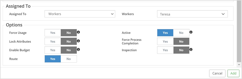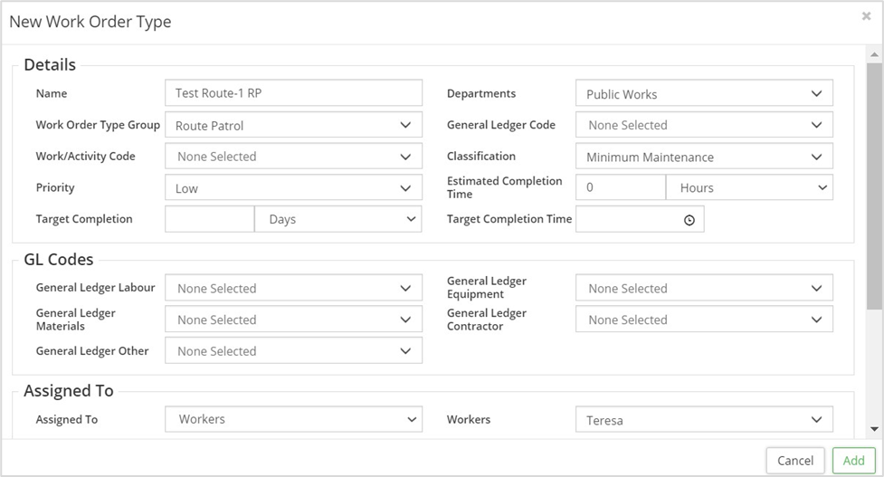 - Click +Add on the WOT grid, to create a Route-WOT for scheduling patrols for Routine Route.