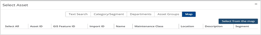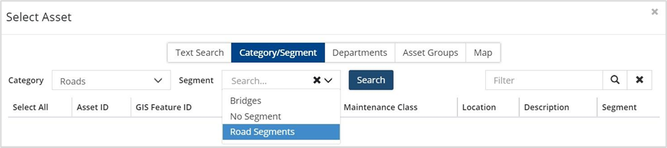 The search is conducted on the fields listed (Asset ID, GIS Feature ID, Import ID, Name, Maintenance Class, Location, Description and Segment) and may be further narrowed down by entering a keyword in the Filter field. - Category/Segment: Search and select assets by Asset Category and Segment. Refine search results using a keyword in the Filter field.