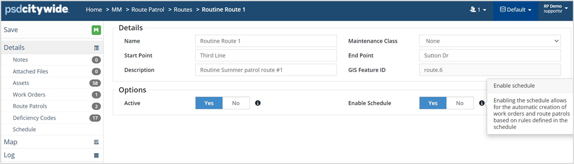 - The Scheduled-WOs for patrolling the Route will be periodically generated till the schedule is active. The WOs can be stopped by entering a Schedule End Date or by setting the Enable Schedule toggle to No.