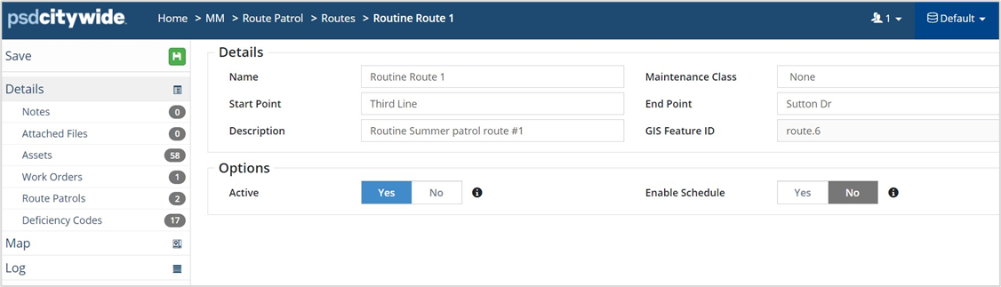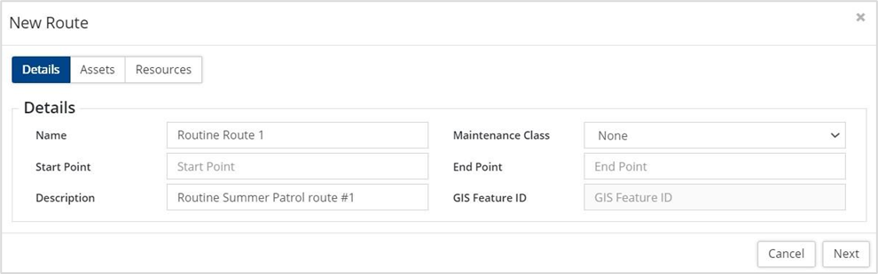 - In the Details section, enter a name and description for the route. The GIS Feature ID is populated once GIS linked road assets are added to the Route. Maintenance Class may be assigned if all constituting road segments belong to the same Class.