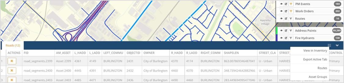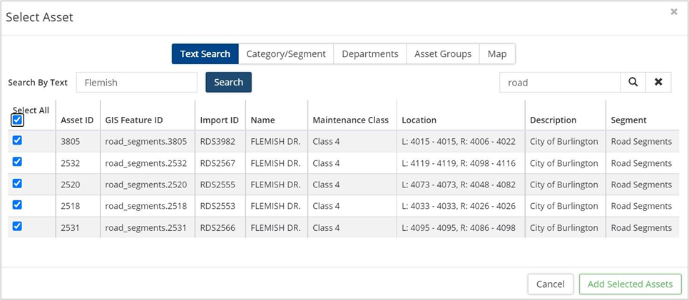 - Text Search: Search and select assets through a Text Search for the name of a road segment or Asset ID.