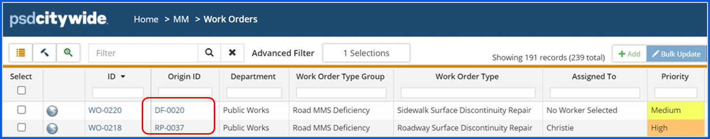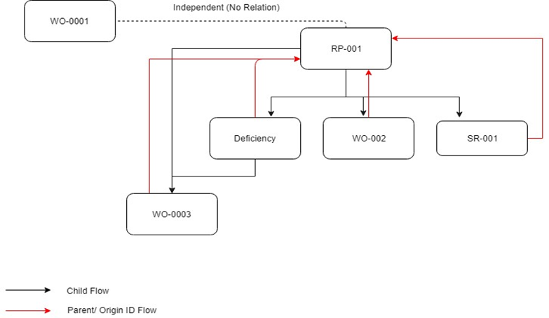 WOs generated from a deficiency, have Origin IDs prefixed with DF (i.e., DF-0000), and WOs created during an active patrol from a mobile device have Origin IDs prefixed with RP (RP-0000).