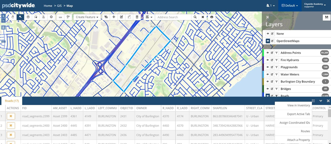Once the road assets have been selected, click the Context Menu in the Attributes table and select Asset Groups (see screenshot below). The New Asset Group wizard opens and the assets can be saved as a collection.