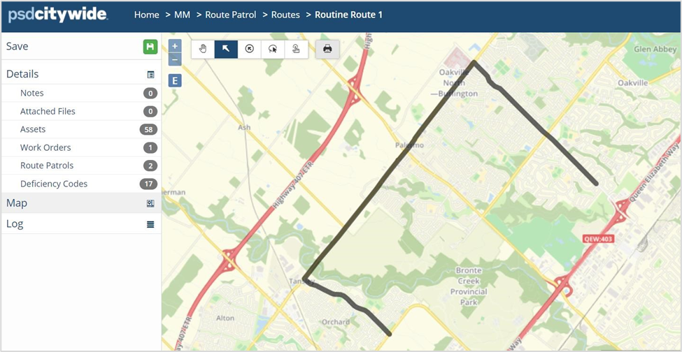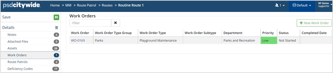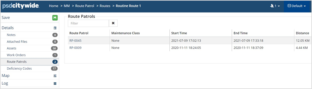 - Route Patrols conducted on the route, as well as Work Orders created during patrolling, are listed under their respective tabs.