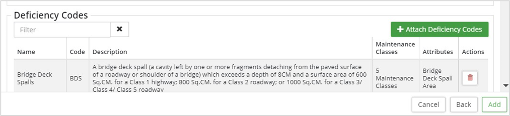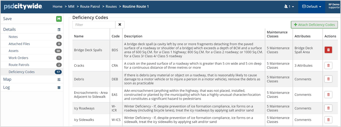 - Deficiency Codes attached to the route can be removed by clicking the Trashcan icon against it and other deficiencies can be added using +Attach Deficiency Codes.