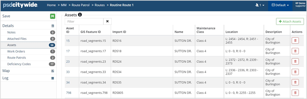 - Click +Attach Assets to attach road assets constituting the Route. If MMS compliance for patrolling needs to be determined (Advanced RP), then the assets must be linked in GIS.