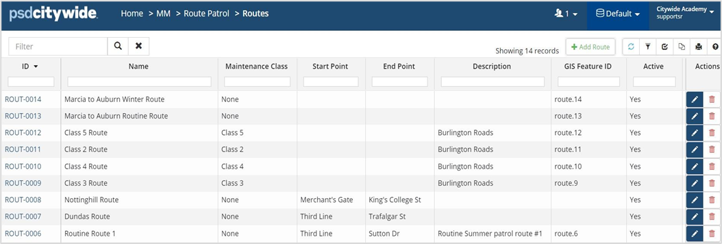 - The route is added to the Routes grid and all routes which have GIS-linked assets attached can be viewed on the Maintenance-GIS map.