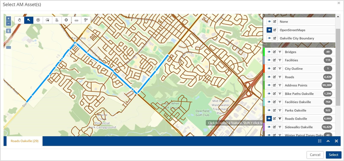 Select the desired Asset Group from the dropdown menu. Select assets by clicking Select All þ. Click Add Selected Assets to add the selected assets to the Route. - Map: Click Select from the Map to visually select the assets from the linked-road layer in GIS.