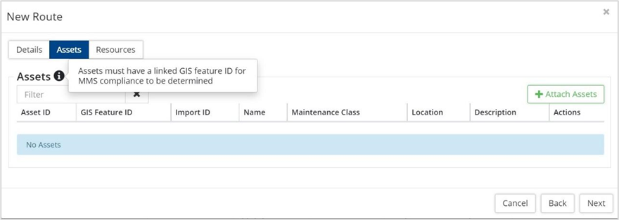 Attaching assets to a Route is preferred only when the assets are linked to a GIS feature as it enables visualizing the route in the map and computing MMS asset compliance using Route Patrol Artificial Intelligence (AI). This is referred to as Full/Advanced Route Patrol functionality.