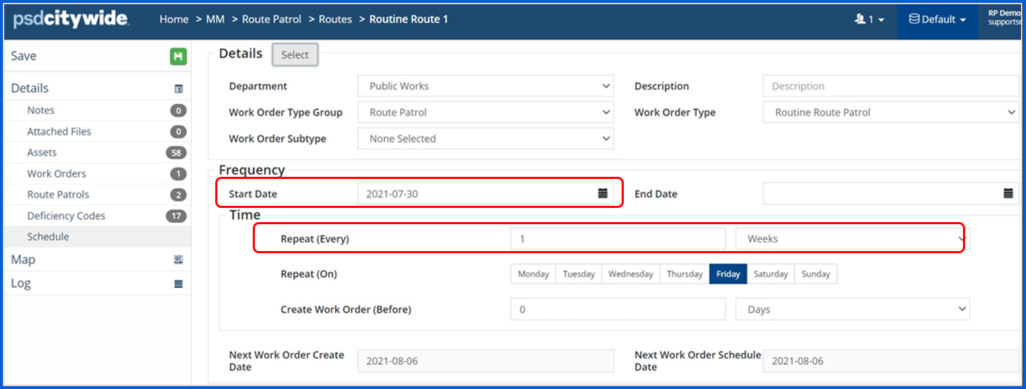 - Enter the Start Date and frequency of the route schedule and the time interval between the patrol due date and when the WO for the patrol will be created.