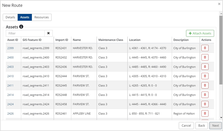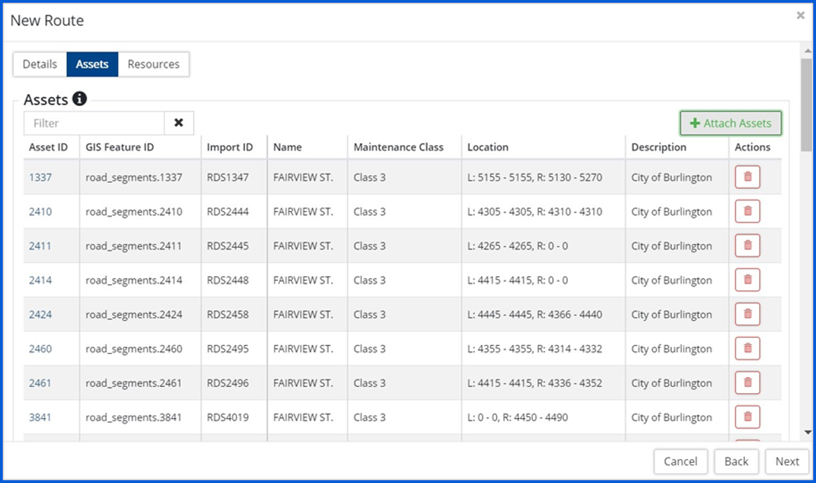 - Assets attached to the route can also be viewed and managed. A user with appropriate permissions can remove an asset from the route by clicking the Trashcan button and/or attach a new asset using +Attach Asset.
