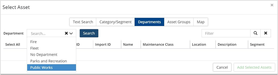 - Departments: Search and select assets by Department and refine results using the Filter.