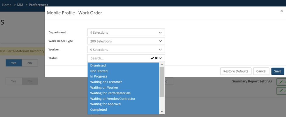 - In the User Preferences section, customize Mobile profile – Work Order Filter. These preference settings are specific to each User.