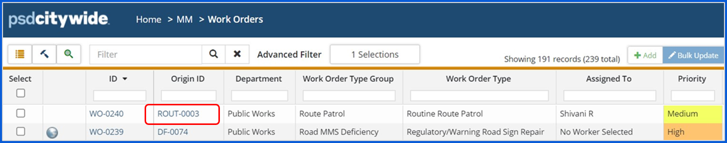 The different types of work orders related to Route Patrol can be differentiated based on the Origin ID of the WO as seen on the WO grid.
