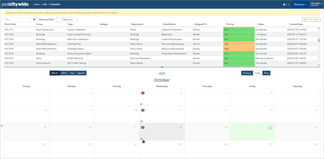 Schedule is used to keep track of upcoming WOs and view activity by month, week, or daily.  By default, the first 100 work orders are shown and users with the appropriate permission levels can filter, modify, and create new work orders.