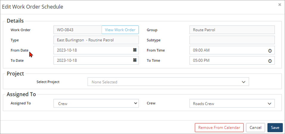 2. Click Remove From Calendar in the lower right corner, to delete the scheduled start/end date and time. Click Remove in the prompt and the WO will be removed from the calendar view.  (Navigate back into the appropriate WO and set the scheduled date/times on the Detail screen if the information was inadvertently deleted.)
