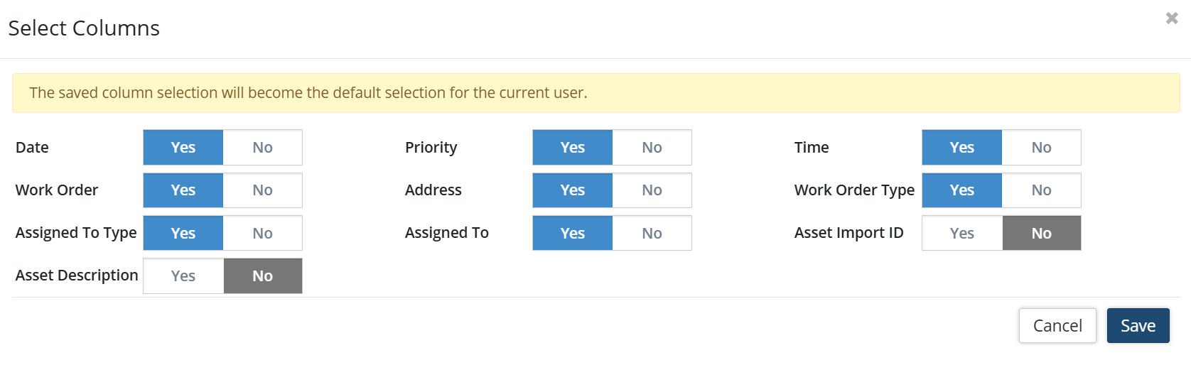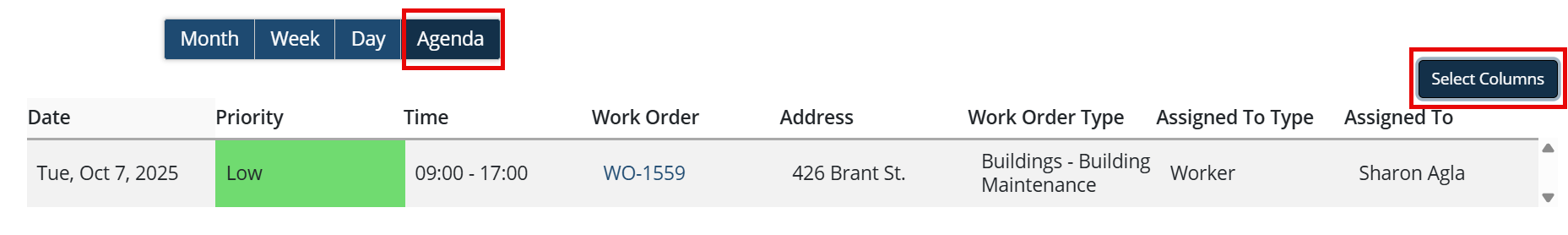 5. Agenda view shows a list of your work orders with the ability to select the columns you would like displayed. The Select Columns window allows you to choose the column selections that you would like displayed.  The saved selection will become the default for the current user.