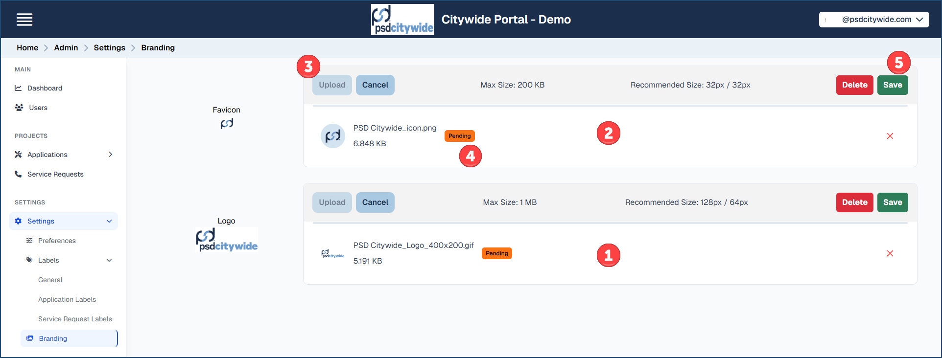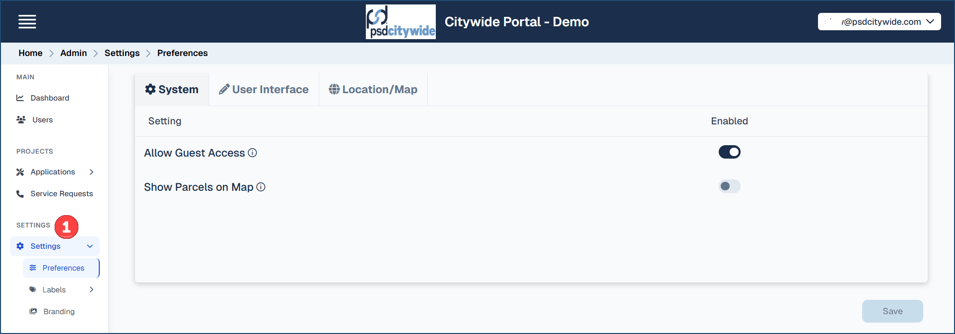 This is the place where you set up the unique features and characteristics of your Citywide Portal interface. The Settings Navigation Pane shows Preferences, Labels and Branding ❶:
