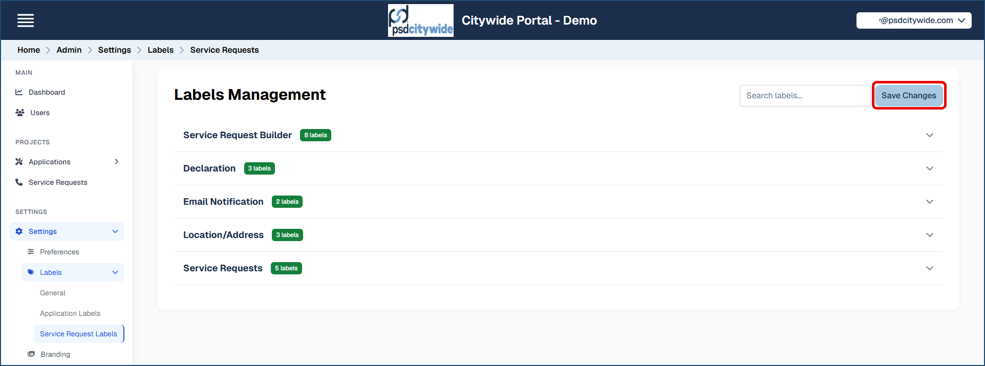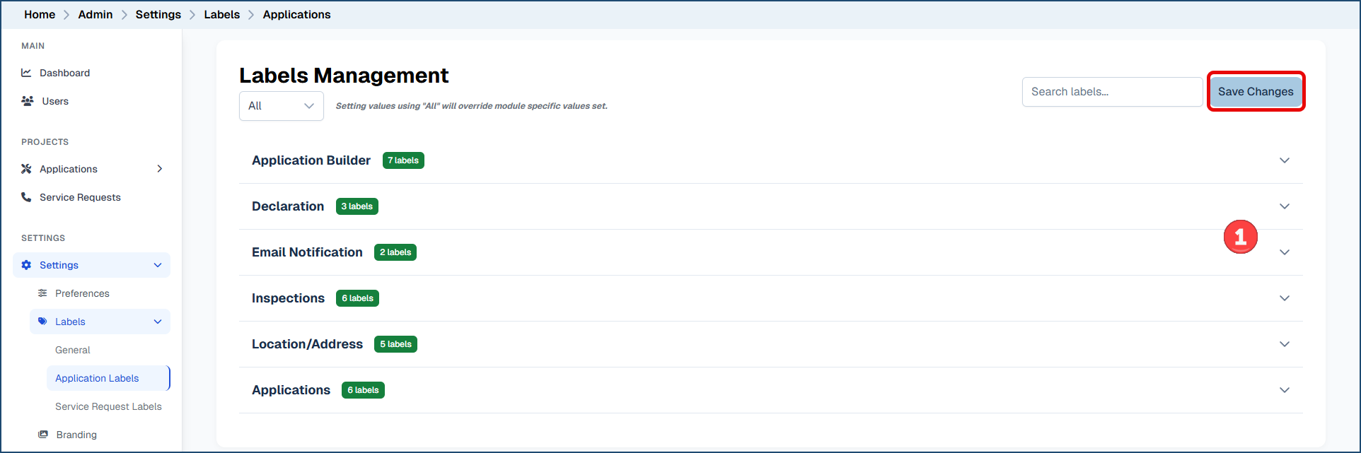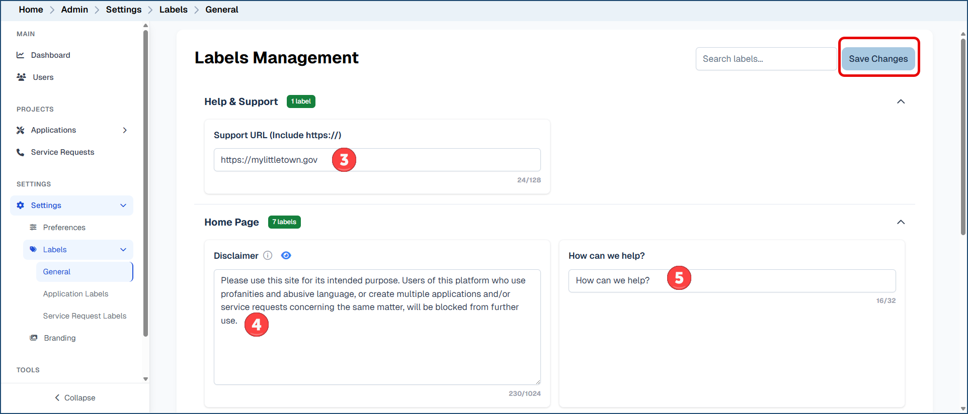 - Labels refers to field or module names, where you can rename the field or module names that better suits your municipality's requirements. It is also where you set up characteristics of the Home page.
