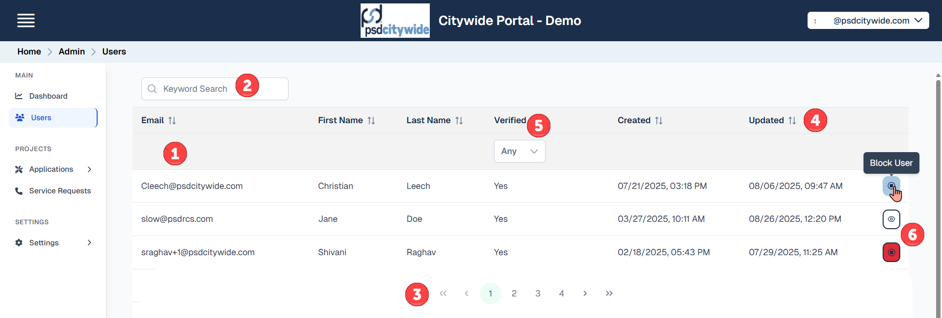 The Verified column ❺ displays whether the user has replied to the validation email sent to them during the registration process; the dropdown in the Verified column header allows you to filter the listing on Verified Yes/No statuses.
