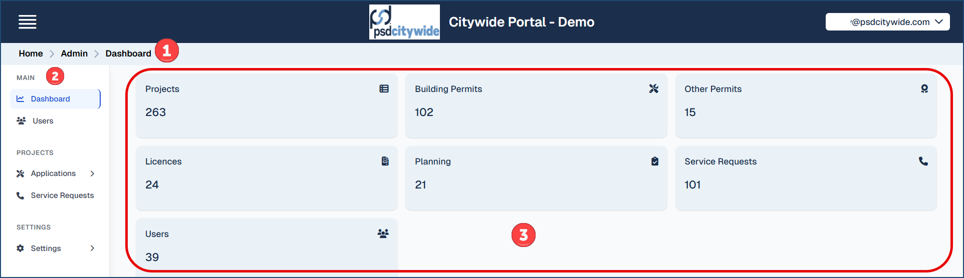 This is the Administrator interface ❶, which defaults to the Dashboard function. All the other functions are accessible by clicking on the menu items on the left side of the screen ❷: