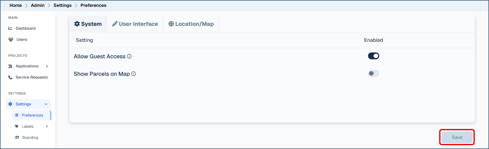 - Preferences allows client admins to customize and set portal preferences such as hide fields or make required fields mandatory to complete when submitting a permit application(s) or service request(s) via the portal.
