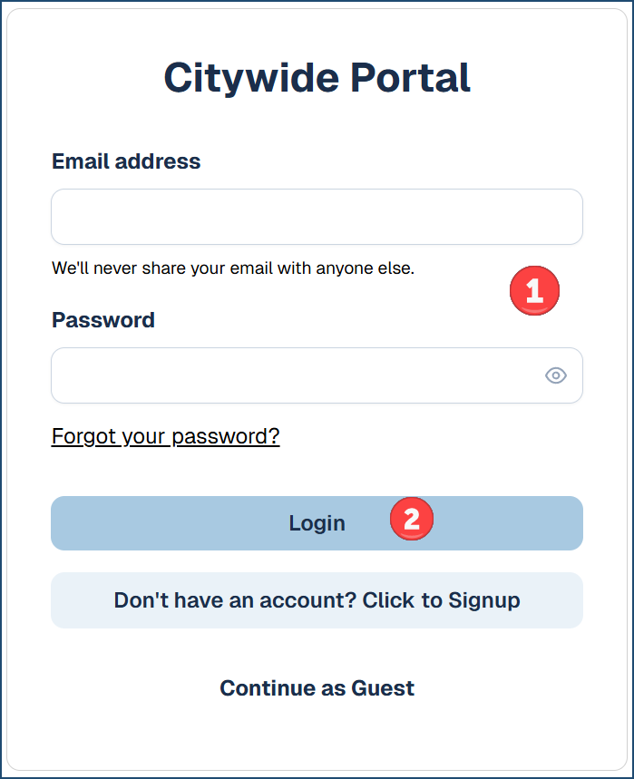 - After the client admin permissions are set, login to the Citywide portal with your email and password ❶.