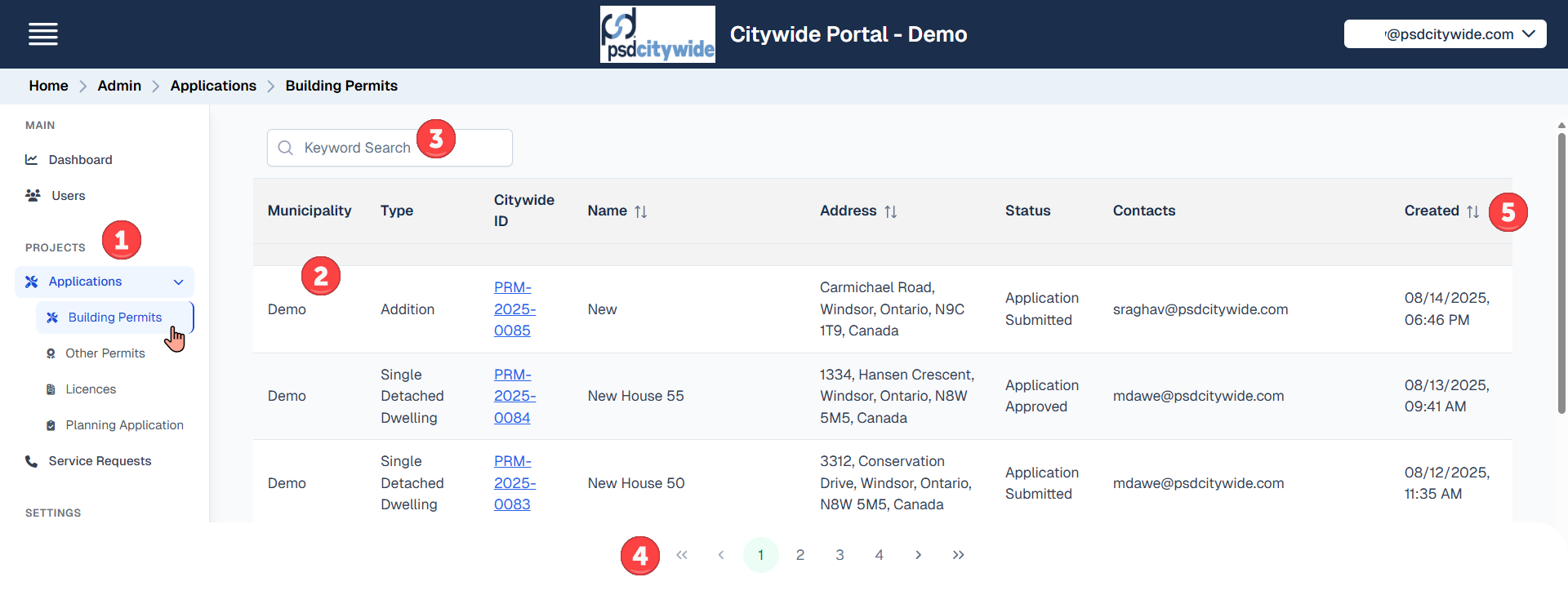 The navigation pane shows the various Permit Types ❶. The list ❷ on the main panel displays the items corresponding to the chosen permit type (e.g. Building Permit applications in the above screenshot).