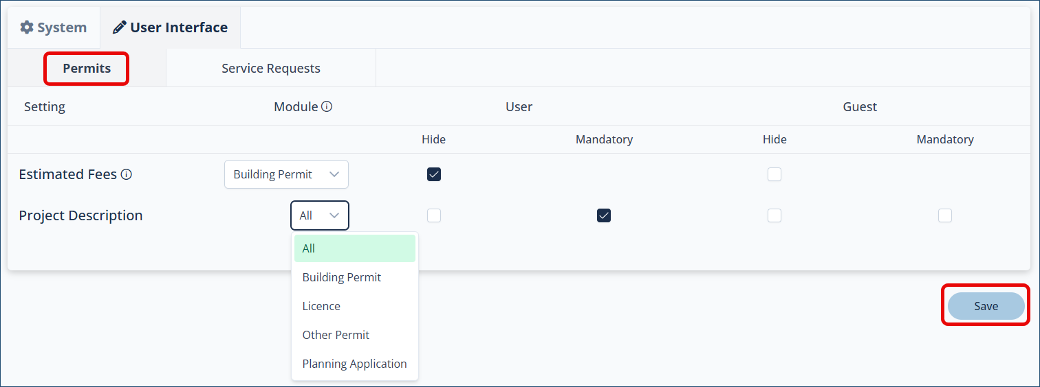 - Select which module to hide or make fields mandatory to complete (ie. Building Permit as shown in the image)