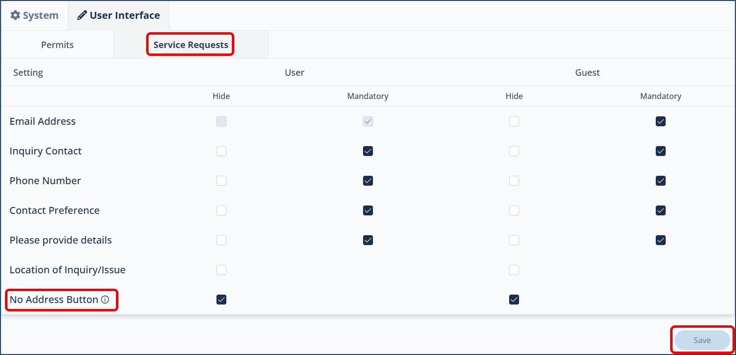 - Check the applicable box(es) to 'Hide' or make a field 'Mandatory' to complete when submitting the service request either as a registered 'User' or a 'Guest' (if enabled).