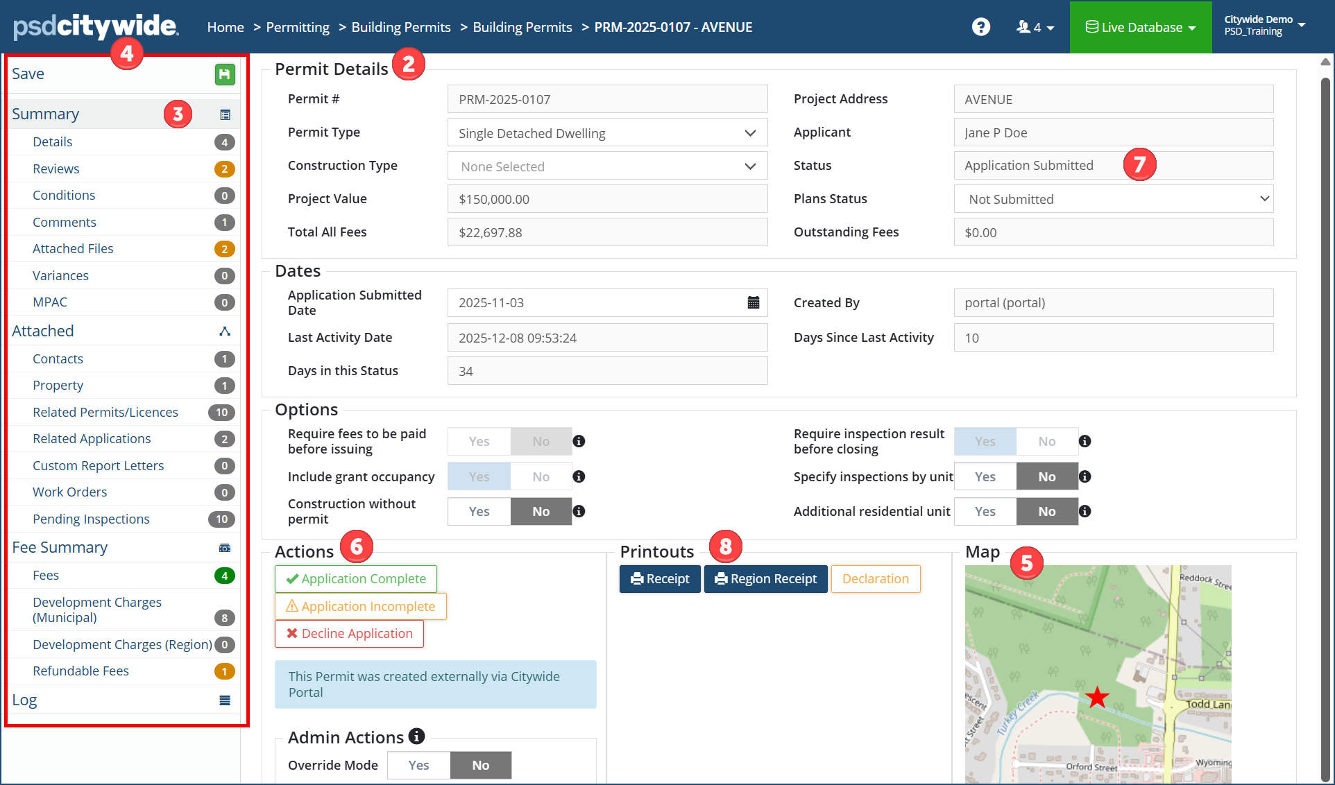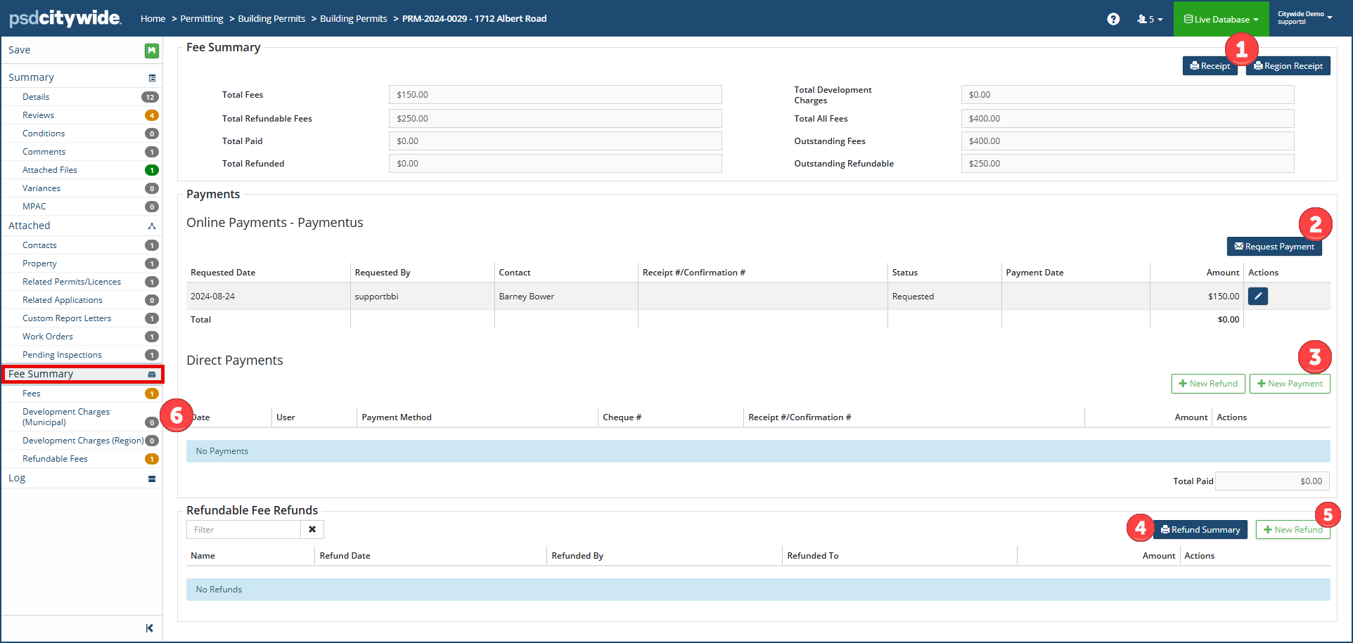 The Fee Summary screen summarizes all fees, charges, payments and refunds associated with the current permit, and it provides you with the ability to issue receipts ❶, process online ❷ and direct payments ❸, and view ❹ and issue refunds ❺. All of fees, charges, and refunds are entered in the respective sections ❻ below Fee Summary.