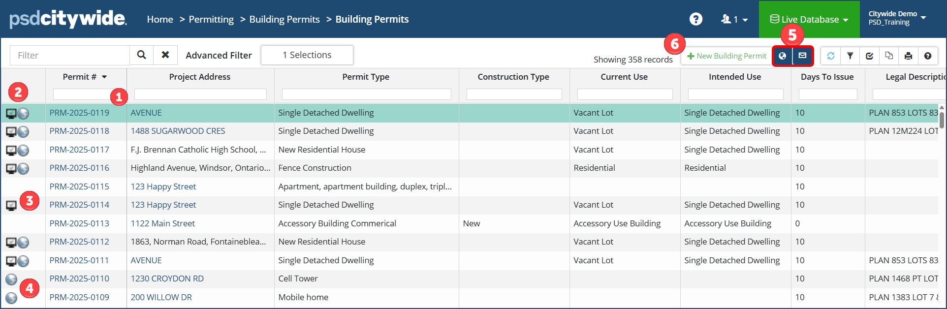 This is the Building Permits screen, which lists all the Building Permits in the system (currently) sorted in reverse chronological order by their unique, system-assigned Permit number ❶: