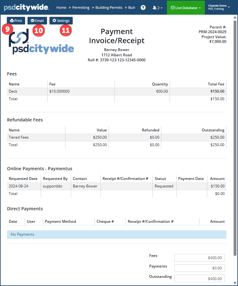 - Click Request Payment ❷. All the contacts associated with the current permit will appear on the Request Payment page:
