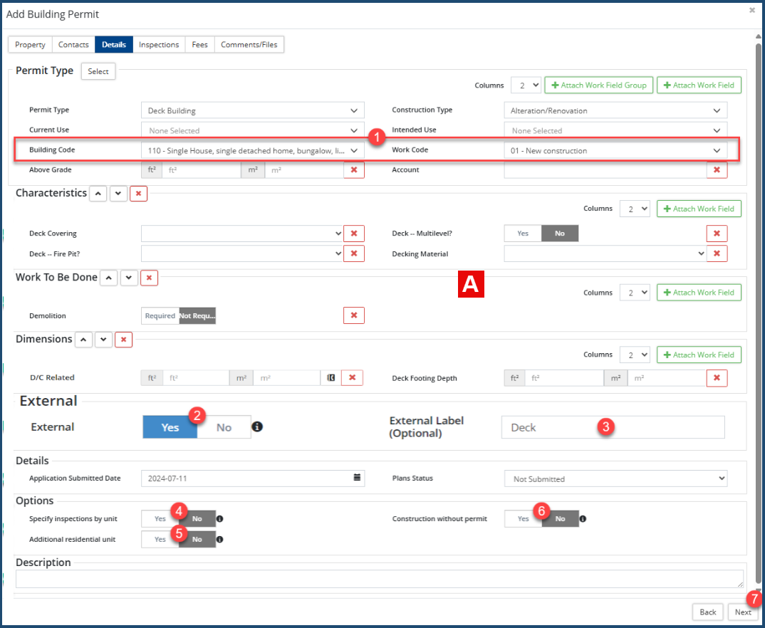 Most of the fields on this screen are self-explanatory. The Building Code and Work Code fields ❶ are hard wired in the system, each containing the codes for this jurisdiction. Setting External ❷ to Yes makes this permit available for viewing on an external application, such as the Citywide Portal, with the option of providing an alternative field label ❸ for it (e.g. Deck Building 🢡 Deck). All the other fields on any one of your Building Permits should be known to you. Enable Specify inspection by unit ❹ if the permit involves multiple units and each unit is to be inspected individually, thereby generating inspection records for each unit. Additional Residential Unit ❺—which involves a dwelling unit contained or attached to the primary dwelling unit and/or a secondary single detached dwelling unit on the same lot as the primary dwelling unit, accessory to the primary dwelling unit—has no application here. Enable Construction without permit ❻ if the construction was started before the issuance of a permit.