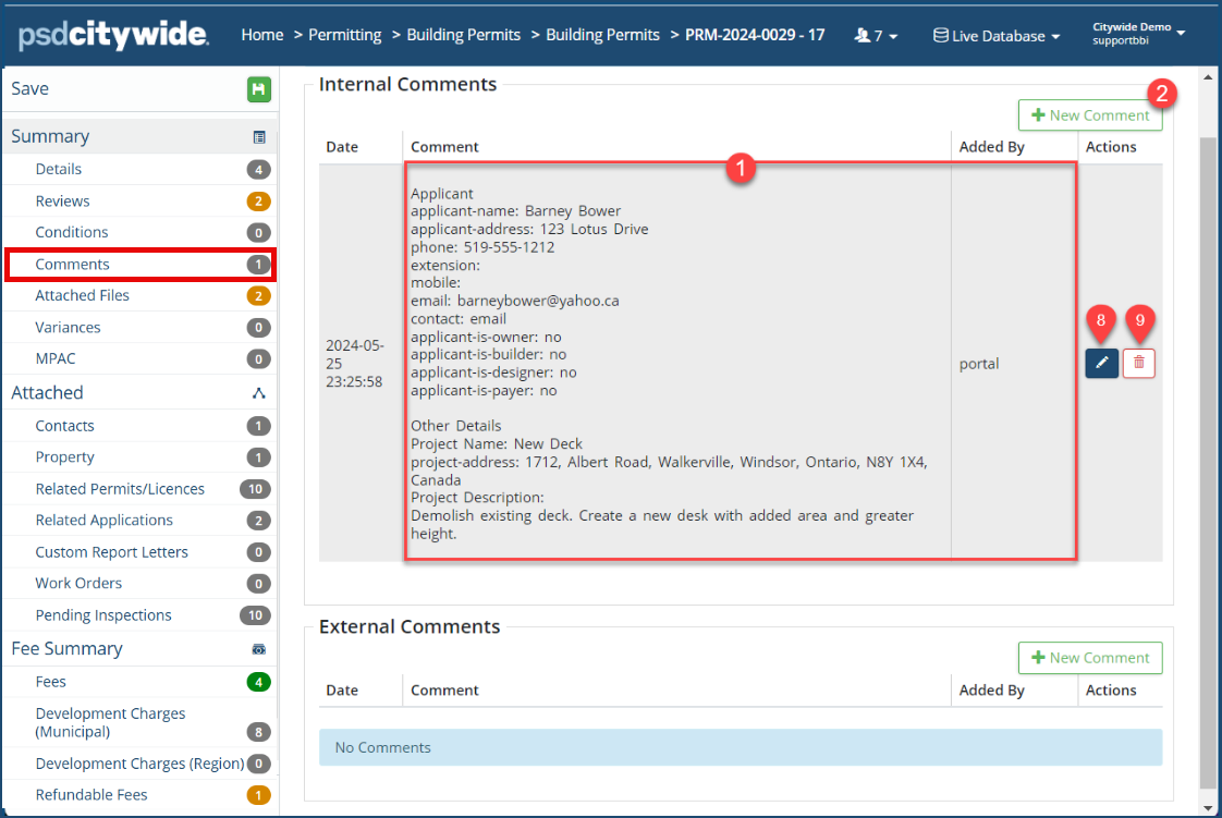 This is where you can add Internal Comments, which may be helpful or informative for anyone within your office having to review this permit. "Internal" means that it will not be visible to permit applicants and other contacts.