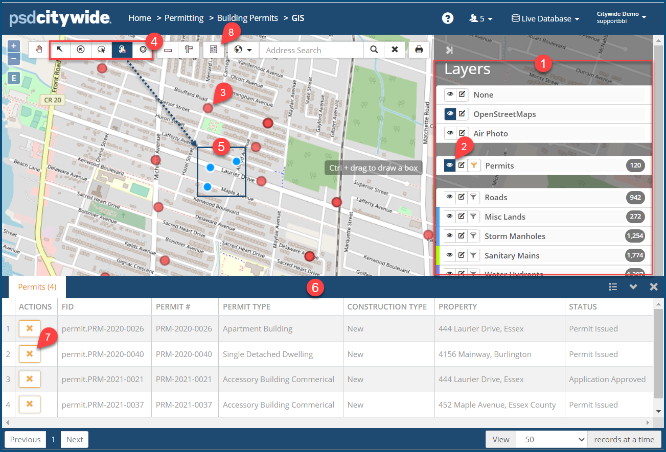 - Use the selection tool to select the permitted properties. (In the above screenshot, the Box Select tool was used to select three properties ❺ whose dots are now blue.) The Permits table ❻ containing data for the selected properties appears, showing three permits for the three properties.