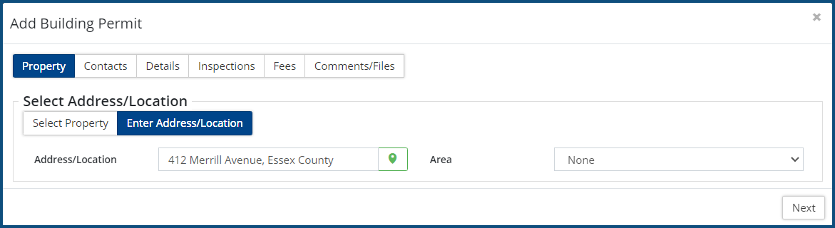 ❷. - Click on the Property parcel address ❸. The Add Building Permit wizard appears: