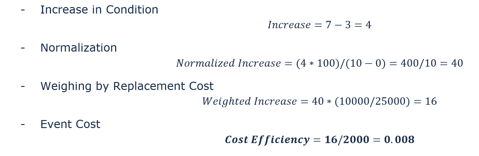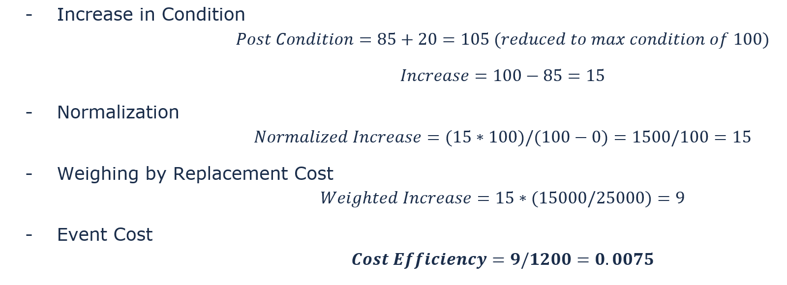 Within that sequence events are ordered by their cost efficiency. Simply put, the cost efficiency of an asset’s event is the increase in condition, which is normalized to a common value, then weighed by that asset's replacement cost, then related to event cost for an increase per dollar value.