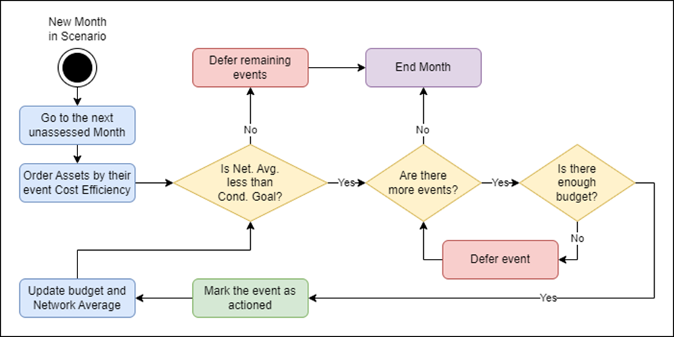 If there is not enough budget in the Scenario for an Event, that event is deferred and the next Event is checked. If after an Event the Network Average is above the Condition Goal, all remaining events are deferred for the month. If after an Event there are no more Events remaining, DS moves onto the next month and starts the cycle over again.