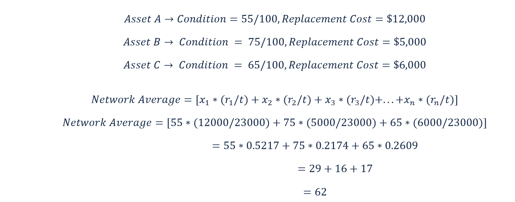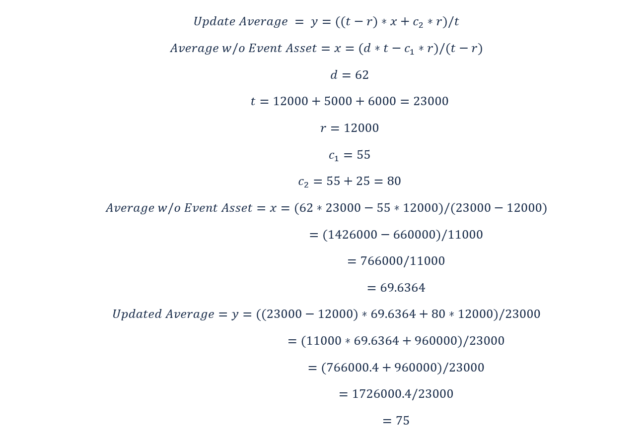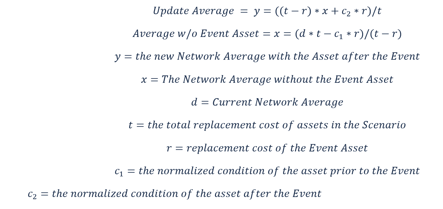 This works by finding what the Network Average would be without the Event Asset by assuming a standard condition on the remaining assets that make the Average possible. Using that value, we can compute the updated average by subbing in the Event Assets new condition. Doing this, it is as easy to recalculate the average of 1000 assets as it is 2 assets