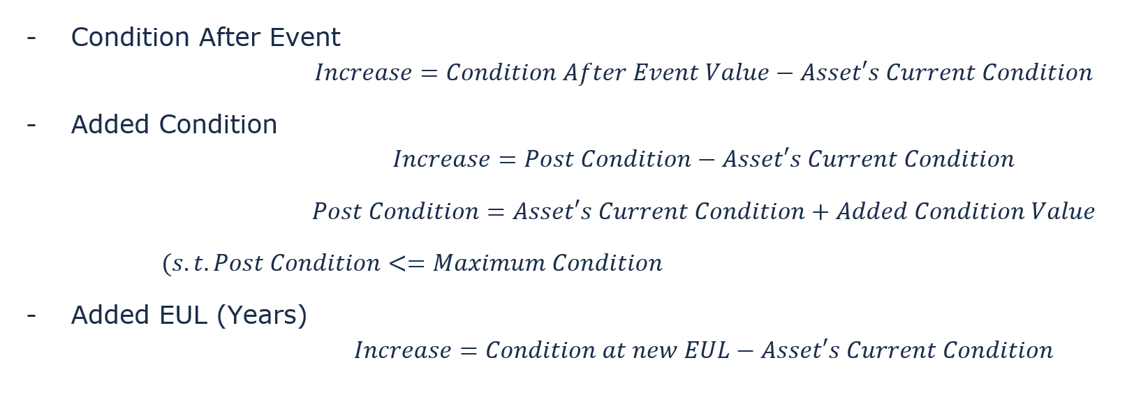 Whenever an Event is committed to being done in a Scenario, that Asset is deteriorated to the end of the month, and the network average is recalculated. This update calculation is a derivation of the “Fresh Network Average Condition” that allows us to access less data points - thus speeding up Decision Support.