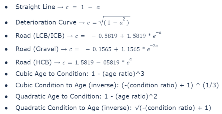Deterioration curves are graphable equations that relate the age of an asset to its projected condition - such that the condition reaches 0 at the end of the asset’s useful life. To be a universal equation, the age and condition used are ratios representing how close an asset is to its maximum age or maximum condition respectively.