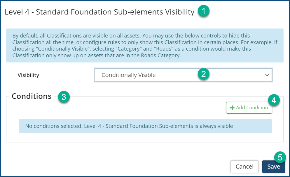 1. Selecting the Conditionally Visible option will expand the dialog box with the Conditions  subsection.