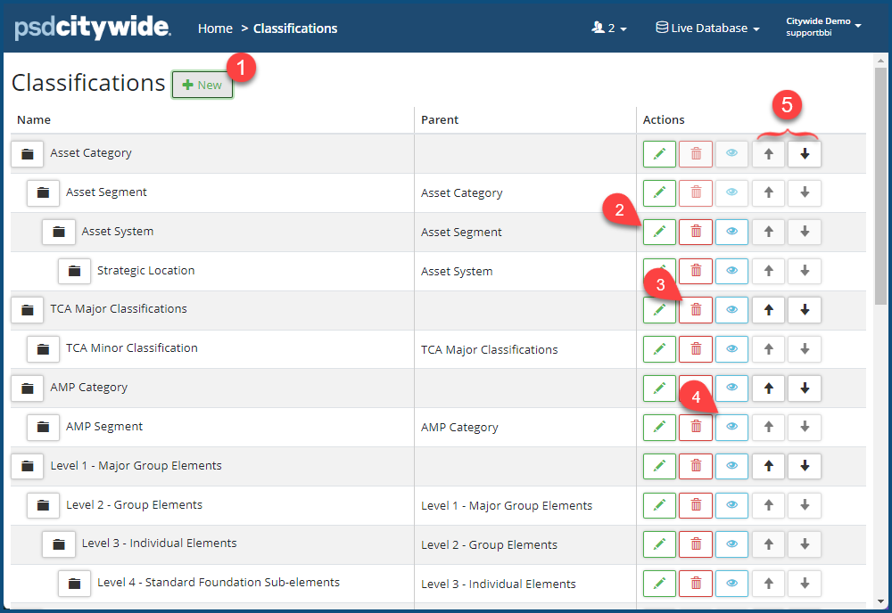 Classifications organize the data within Citywide by grouping similar assets together for labeling, filtering and reporting purposes. In the Classifications section, you can view, add, edit or delete classifications.   In Citywide, there are several predetermined Classifications created based on the universal standard for TCA reporting.
