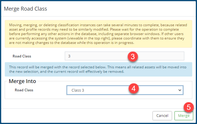 4. Click the  Merge  button to combine the two classifications into one. All assets that were in the classification instance that you chose to merge will be reclassified into the classification instance you chose from the drop-down menu.